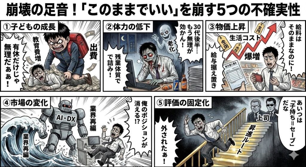 たとえばAI普及で仕事の在り方が変わり、業界再編や構造改革でポジションが消える。大手でも安泰とは言い切れない時代です。