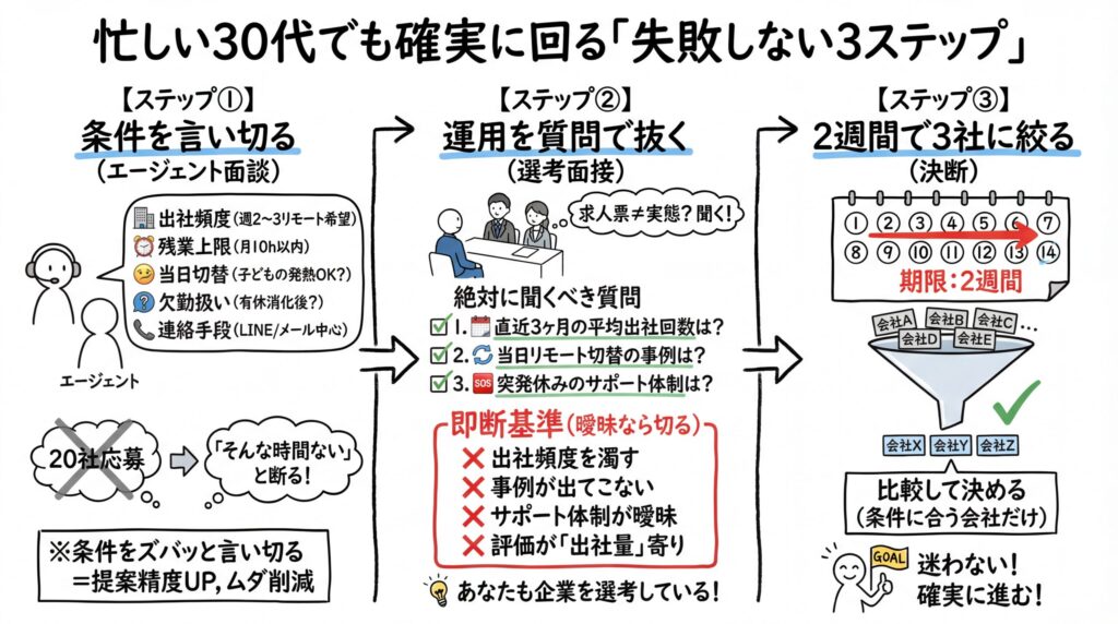 目的は「今すぐ辞める」ではなく、「家庭が回る条件の席」を先に確保することです。