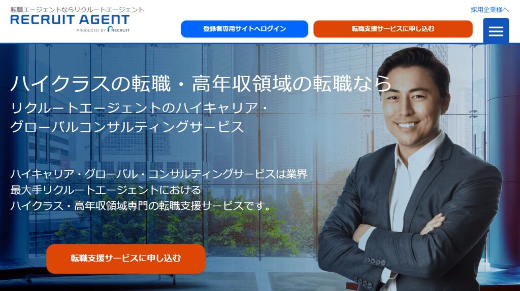 リクルートエージェントには、ハイクラス・高年収領域に特化した転職支援(エグゼクティブ/ハイクラス向け)があります。
