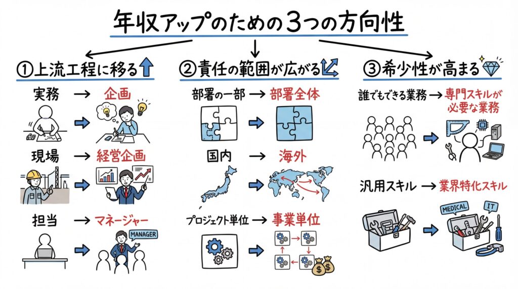 逆に言えば、この3つのどれかが欠けると、年収アップの確率は下がります。