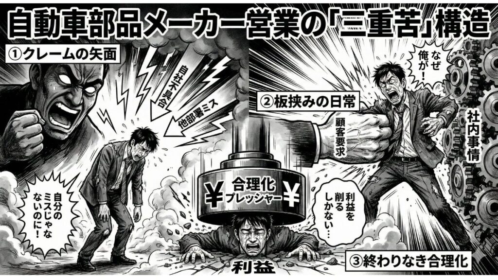 自動車部品メーカーの営業がきついと感じながらも、なかなか抜け出せない構造なんです。
