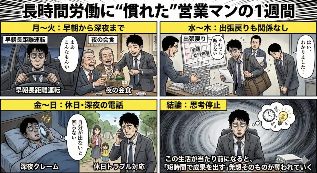 会議室や打ち合わせブースで頭を下げ続ける営業の背中は、外から見ると「立派」に映るかもしれません。でもその裏側では、自分の時間とメンタルを削り続けているんです。(気づいたときには、もう遅いんですよね)
