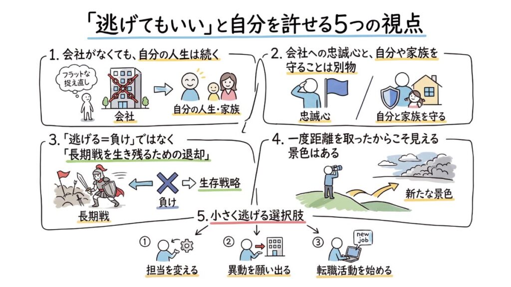 部署異動や担当替え、転職活動のスタートも、すべては長く働き続けるための現実的な選択肢です。逃げることは負けじゃない。むしろ、自分と家族を守るための戦略的な判断なんです。