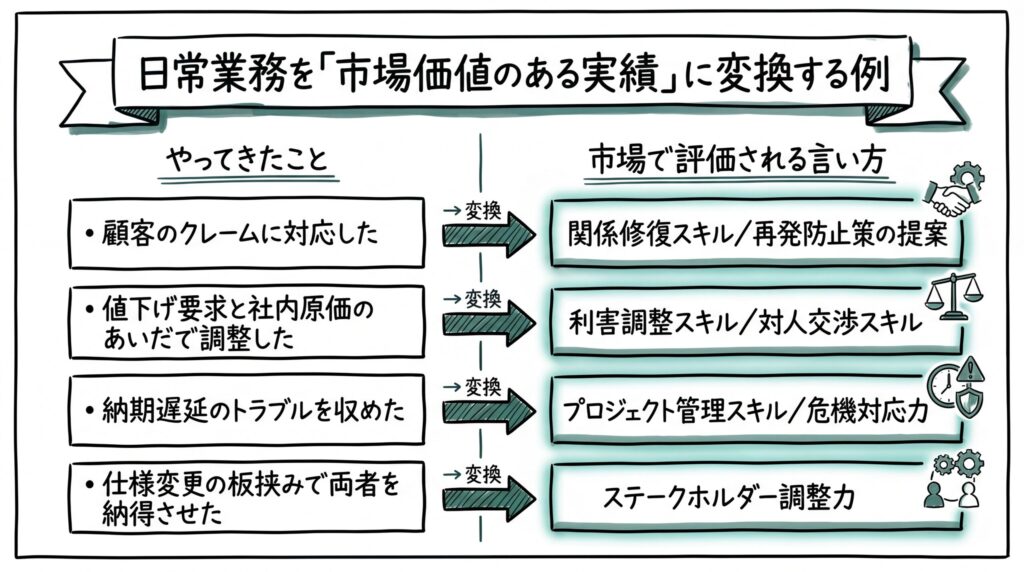 クレーム処理や板挟み対応で消耗した経験も、「どんな課題にどう対処したか」として整理し直せば、市場価値のある強力なスキルに変わります。