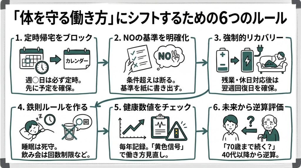 といった「頑張らないライン」と、睡眠・飲み会・健康診断などの習慣をセットで決めておくことが重要。