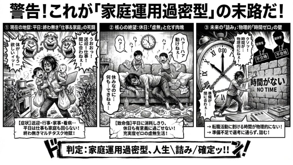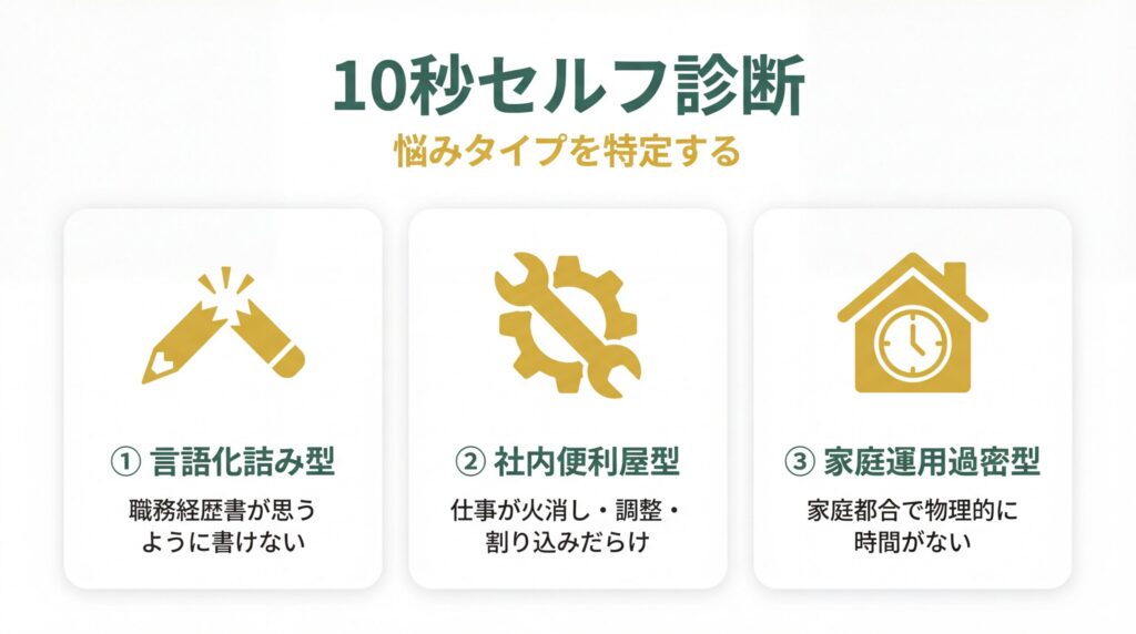 ②の「調整と火消しで成果が見えない」が一番キツいと気づいて、そこだけに絞りました。家庭の時間は減らせないから、転職活動の「やり方」を時短設計に変えたんです。