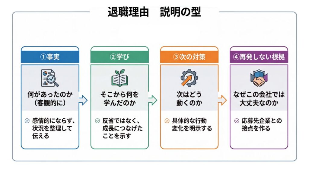 退職理由を説明するときに、以下の4つをセットで出すことです。
