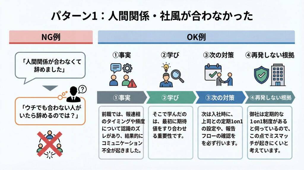 「前職では、報連相のタイミングや頻度について認識のズレがあり、結果的にコミュニケーション不全が起きました。そこで学んだのは、最初に期待値をすり合わせる重要性です。次は入社時に、上司との定期1on1や、報告フローの確認を必ず行います。御社は定期的な1on1制度があると伺っているので、この点でミスマッチが起きにくいと考えています」
