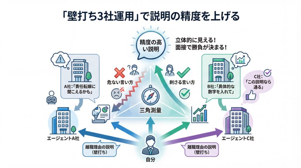 3社のエージェントに同じ話をして、「この言い方なら通る」という型を作ってください。