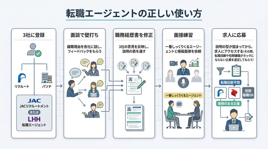 具体的には、転職エージェントとの壁打ちで「離職理由の説明」と「再発しない根拠」を言葉にしてから、求人応募に向かう。この順番にするだけで、面接で詰まらなくなります。