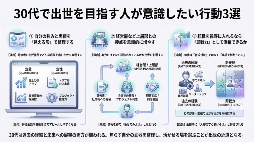30代という年代は、責任も重くなり、周囲からも「次のリーダー候補」として見られ始める時期です。このタイミングをどう活かすかで、今後の昇進ペースは大きく変わります。