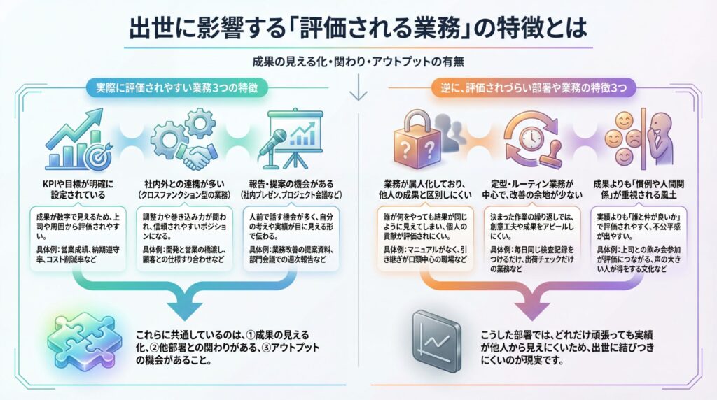 出世を左右するのは、所属部署だけではありません。次に、実際に評価につながりやすい「業務の中身」に注目してみましょう。