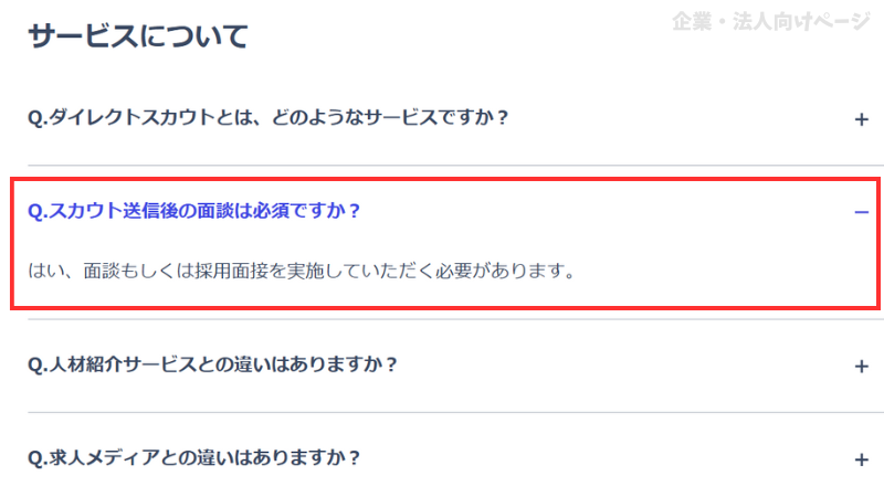 リクルートダイレクトスカウトのよくある質問(企業・法人向け)を覗いてみると、「スカウト送信後の面談は必須」であることがうたわれています。
