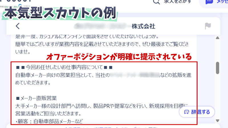 上記は実際に僕が受けた企業からのスカウトです。自動車部品メーカーの営業という経験が企業の求める要件にマッチしたと思われます。具体的な仕事内容など、イメージしやすいですよね。