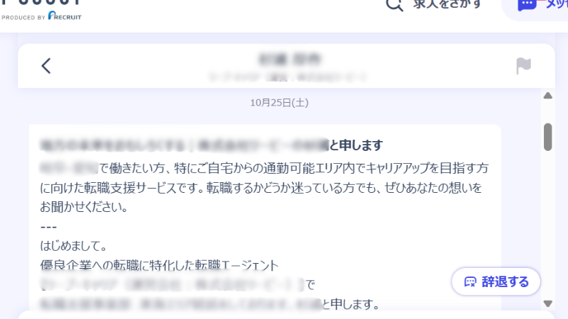 職務経歴やスキルに反応しただけの、形式的なスカウト。ほぼ転職エージェント。