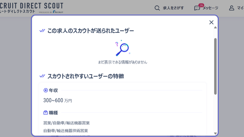 なんと、「スカウト送付ユーザーを見る」ボタンを押すとスカウトされやすいユーザーの特徴がわかるようになっています。企業側が「こういう職種・経歴の人を探している」と明示しているということです。