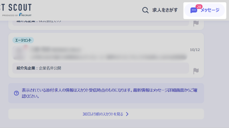 約16日間で、28件のスカウトメールが来ました。ざっくり1日に2件のスカウトが来ている計算ですね。