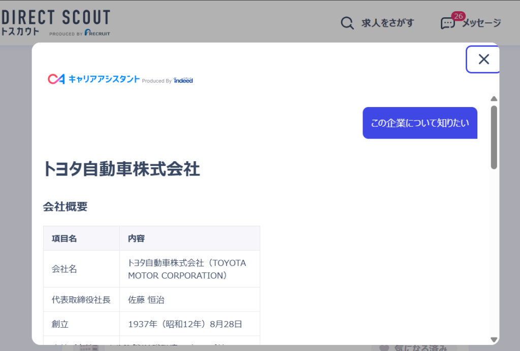 ちなみに3つめの「企業リサーチ」ボタンを押すと、Indeed提供のキャリアアシスタントと連携したAI機能が「気になる企業の詳細情報」を見せてくれます。