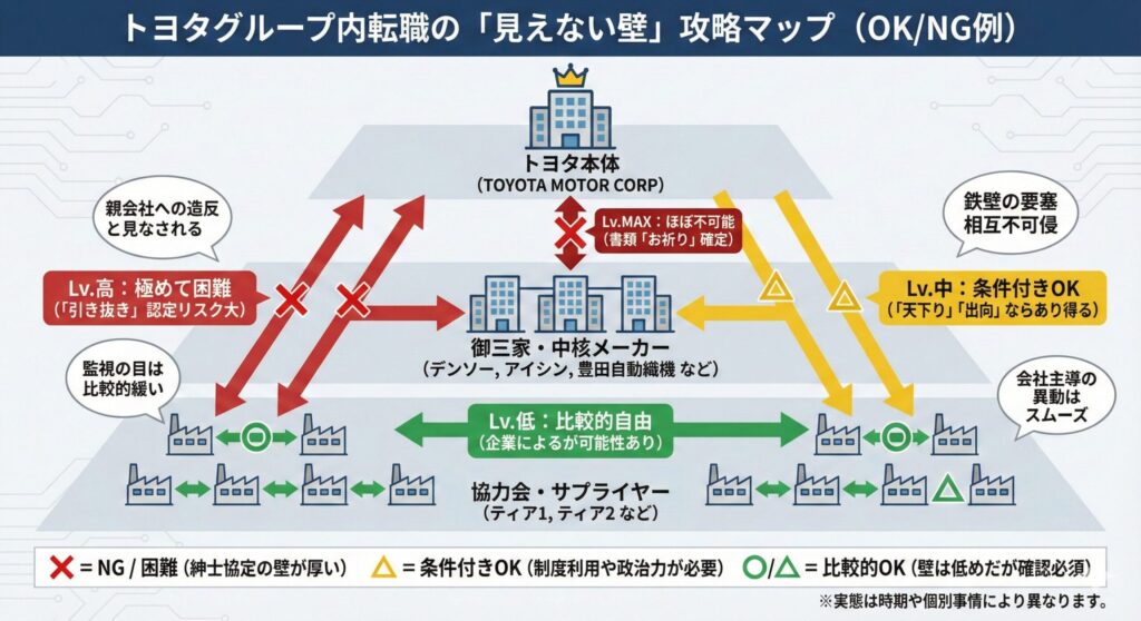 いわゆる「トヨタ本体」と「御三家」と呼ばれる中核メーカー間の転職は、ほぼブロックされていると思っておいた方がいいです。