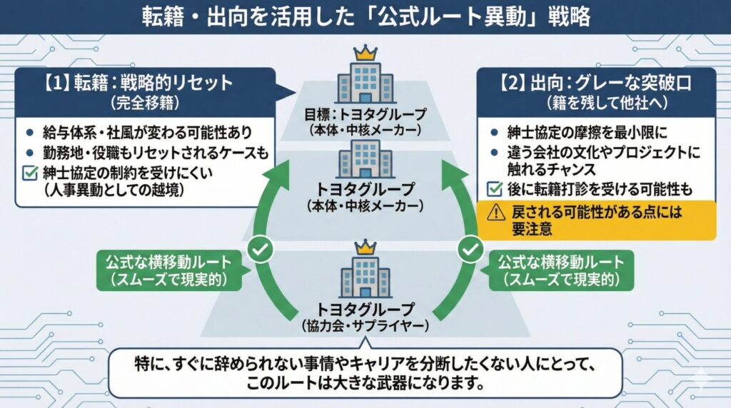 - 公式ルートである「出向・転籍・公募制度」の活用戦略